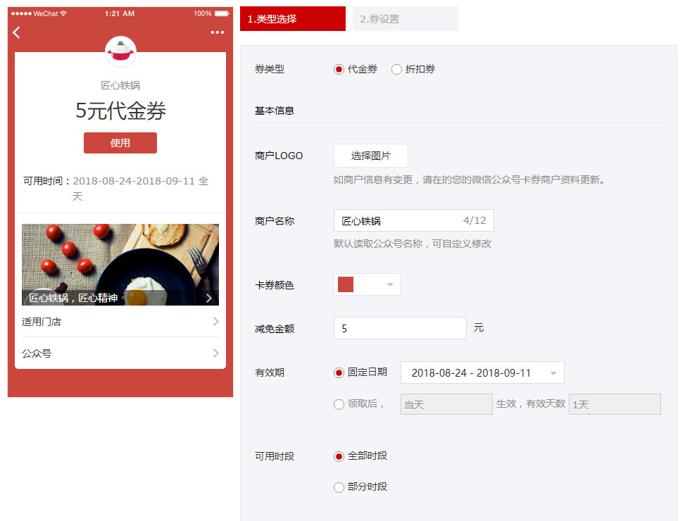 优惠券是商家吸引粉丝和回馈粉丝的一款非常有效的营销工具。 优惠券设置简便,商家只需设置活动名称、活动时间、活动奖项等基本信息。